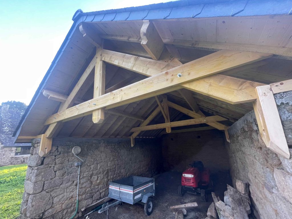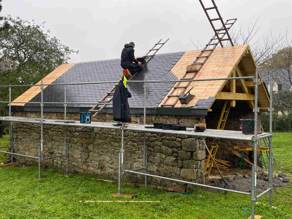 Pour la restauration de cette petite grange en pierre, nous avons entièrement refait la charpente et avons remplacé l’ancienne toiture en bac acier par une couverture en ardoise naturelle.
